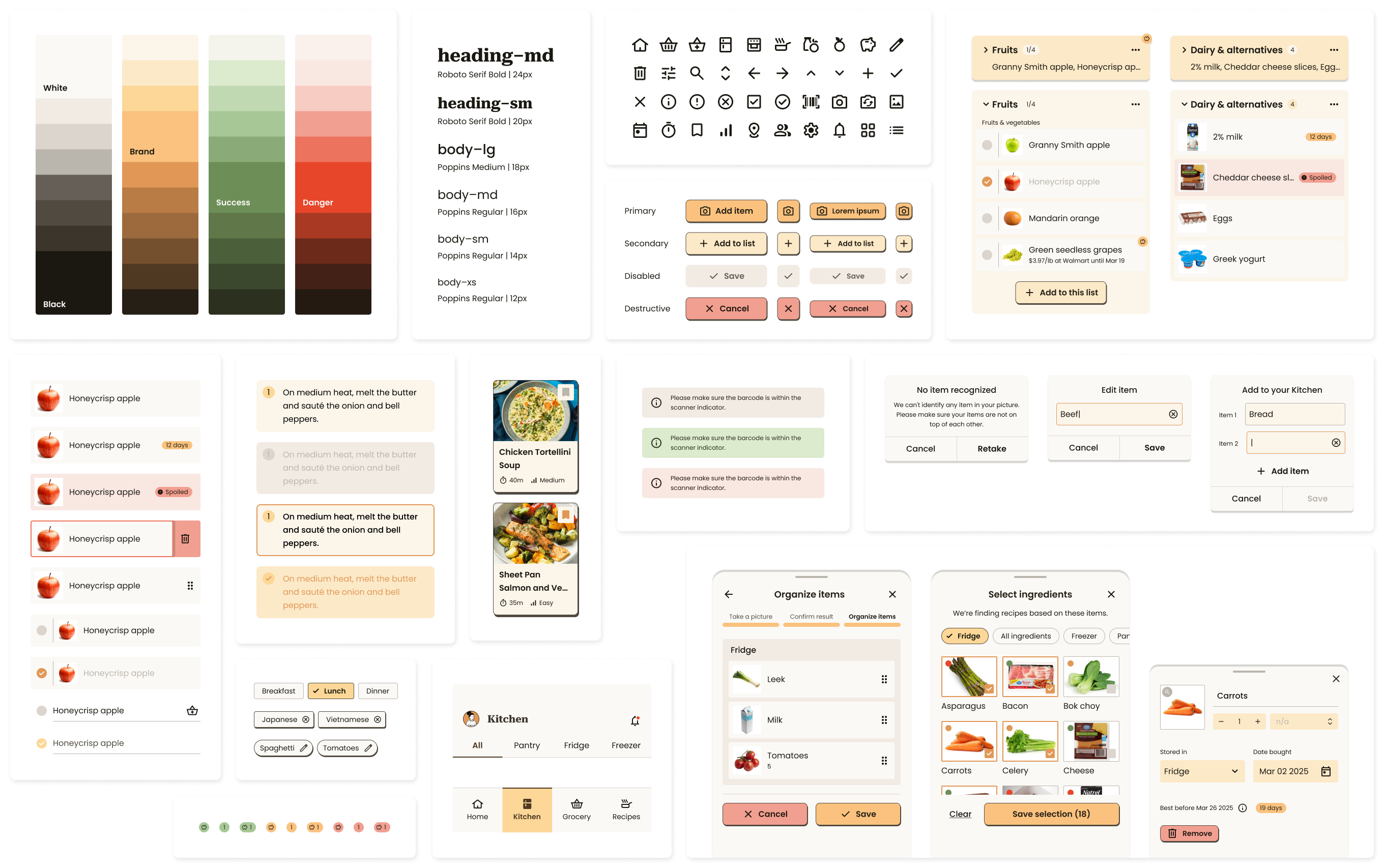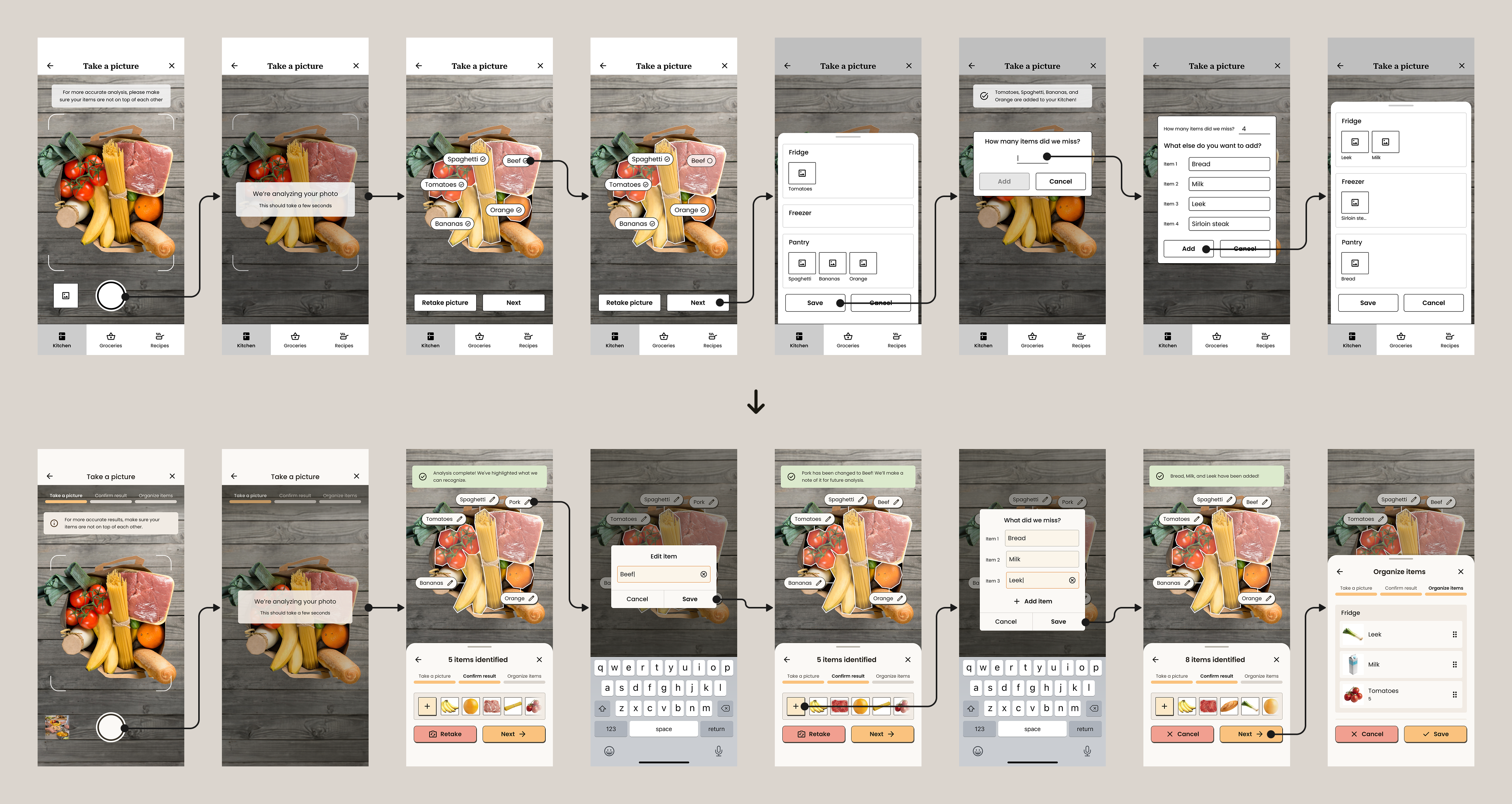 There are commonly two layers of organization when it comes to food and groceries: by space and by type. As I designed the screens and conducted user tests, the organization system evolved to first allow people to organize by the real-life space their items would be in, then by the type of food.