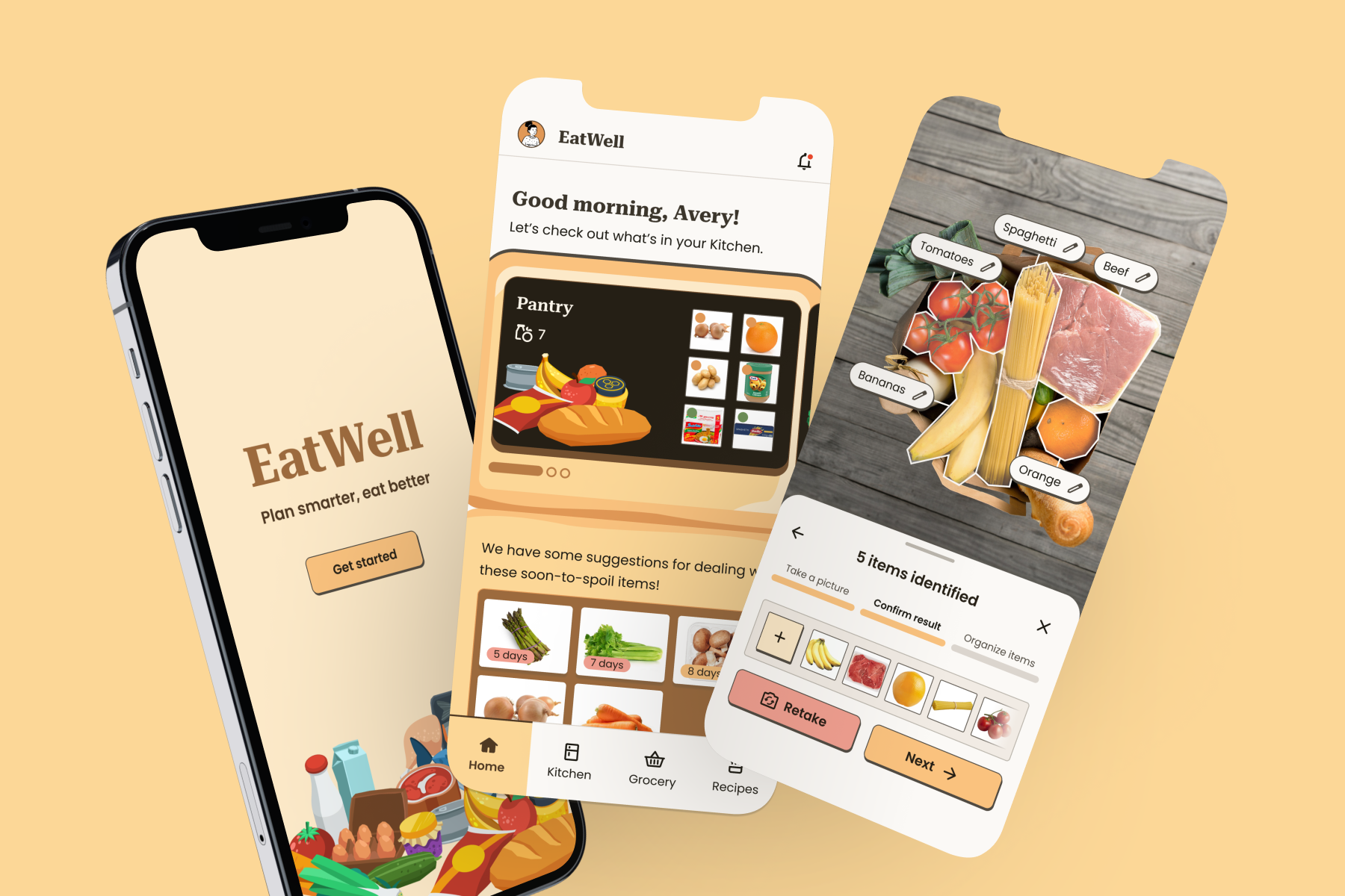 It can be difficult for students to keep track of their groceries and turn their ingredients and leftovers into enjoyable meals amidst busy schedules. From research to design and testing, I explored college students' experience around meals and diets and developed EatWell, a digital tool to minimize obstacles to having healthy meals regularly. With EatWell, users easily manage their kitchen, keep track of estimated spoilage, plan grocery trips, and find recipes suitable for their dietary preferences, cooking ability, and available resources.
