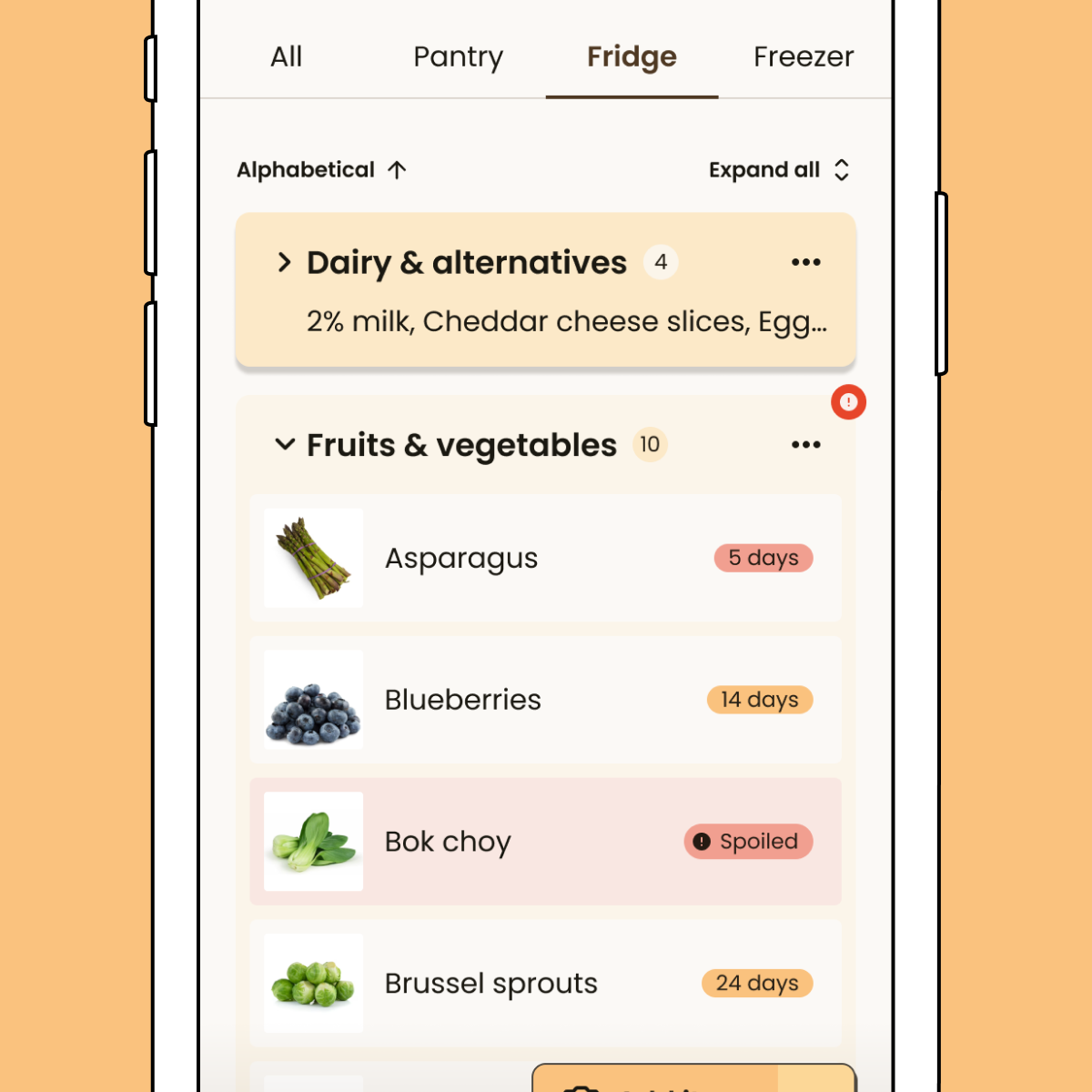 Reduce mental load: Students keep track of expiry dates and estimated spoilage, and when their groceries are running low.