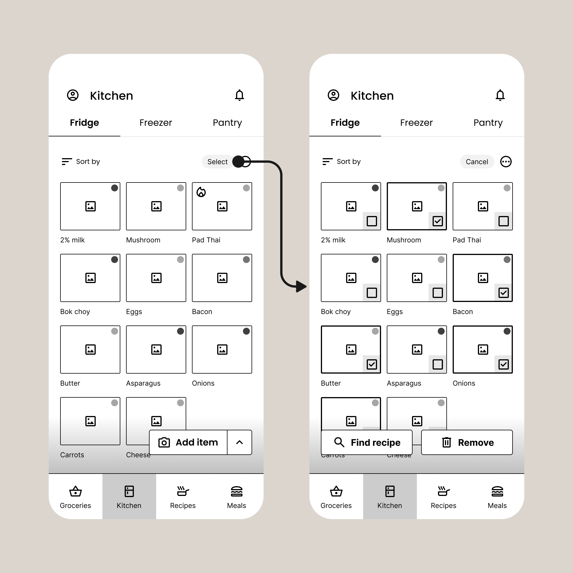 This flow initially started in the Kitchen space to mimic the physical actions of looking in the fridge and getting ingredients.