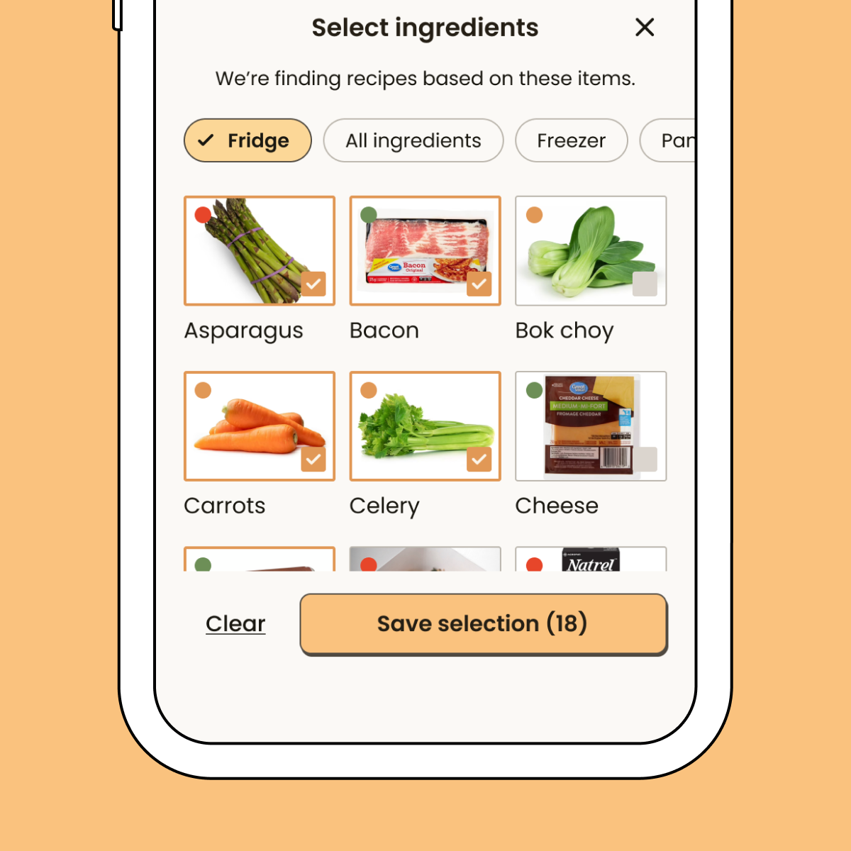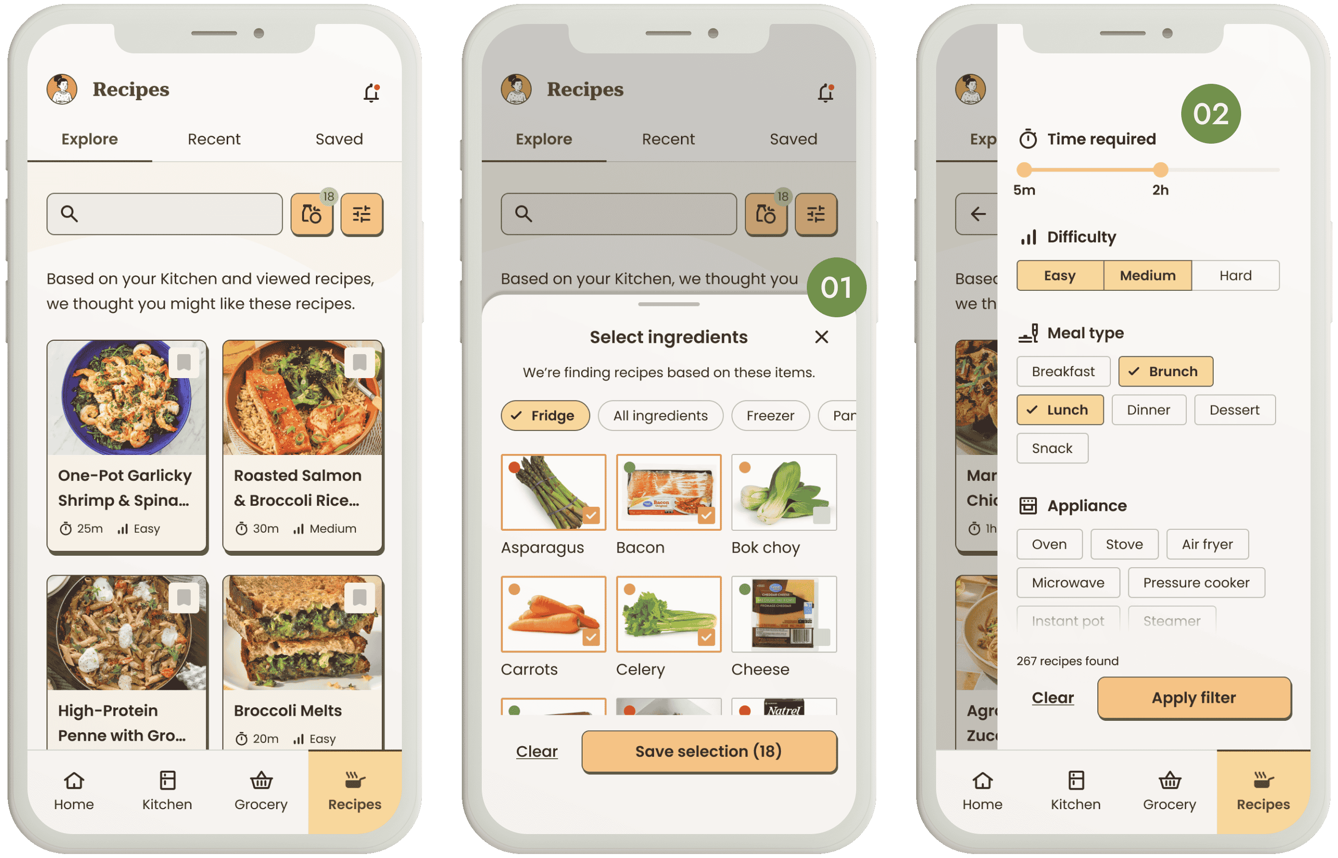 When looking for recipes, users can filter by ingredients (1) and by preferences (2).