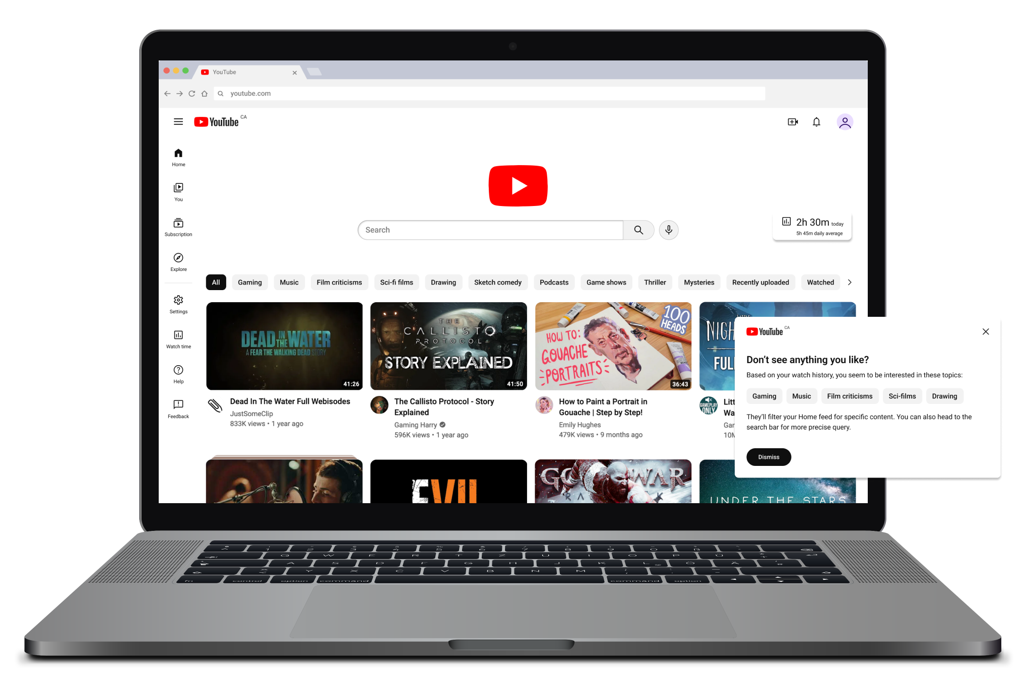 YouTube's features that were initially designed for users' convenience have made it easier for the platform to maximize watch time and engagement, while raising concerns about digital well-being. There are opportunities to redesign the YouTube platform and interface to better account for users' well-being. I reimagined the viewing experience to encourage more intentional actions and remind users to take breaks, with little intrusion on their experience.