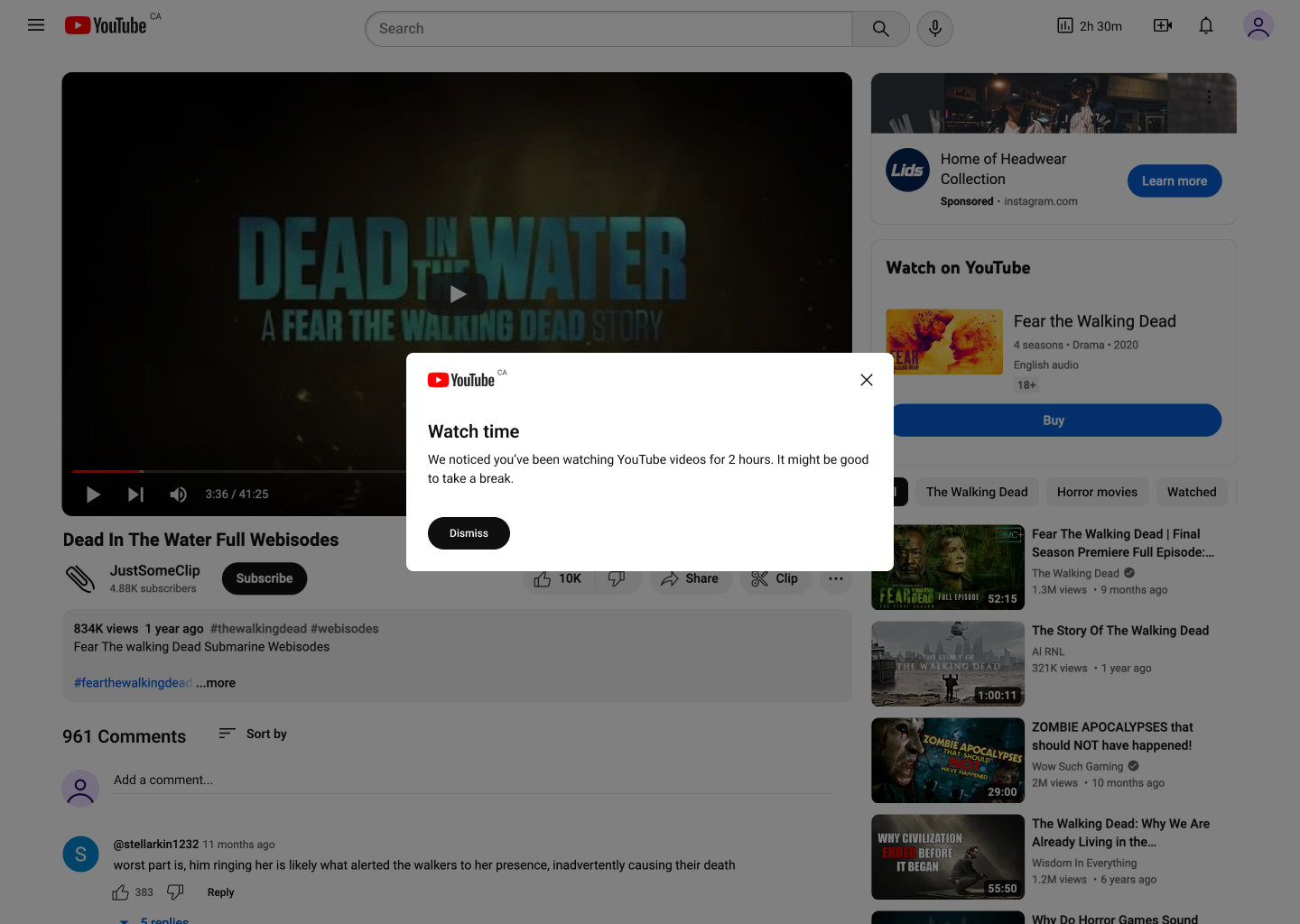 I adapted the app's "Time watched" report for a desktop experience. A pop-up alerts viewers of long usage periods. User testing focused on the placement of the timer and how intrusive it can be on the user experience.