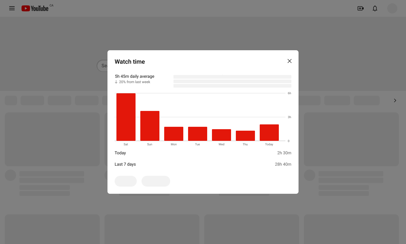 I used the "Time watched" feature in the YouTube app as the foundation to design a time tracking feature and watch time reports for the website. Having an active timer displayed onscreen can be distressing, so the time watched will only update when the user clicks on a new video. Users can disable this feature.