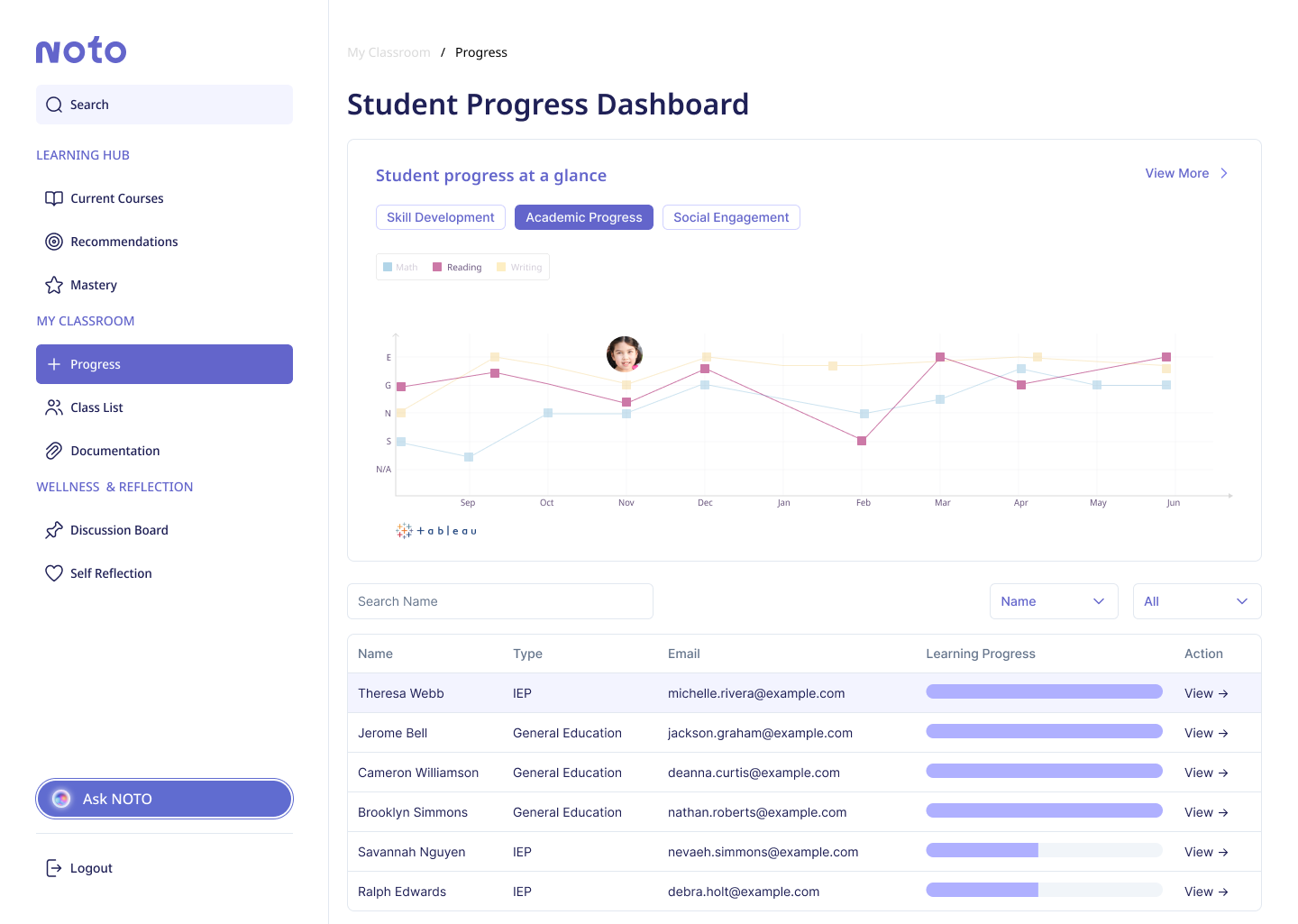 Fragmented support systems put responsibility on already-overworked teachers to navigate increasing neurodiversity in their classrooms on their own. Designed with insights from educators, NOTO provides teachers with accessible, consistent, and practical support through certified professional development content, classroom management and documentation tools, and AI-powered assistance.