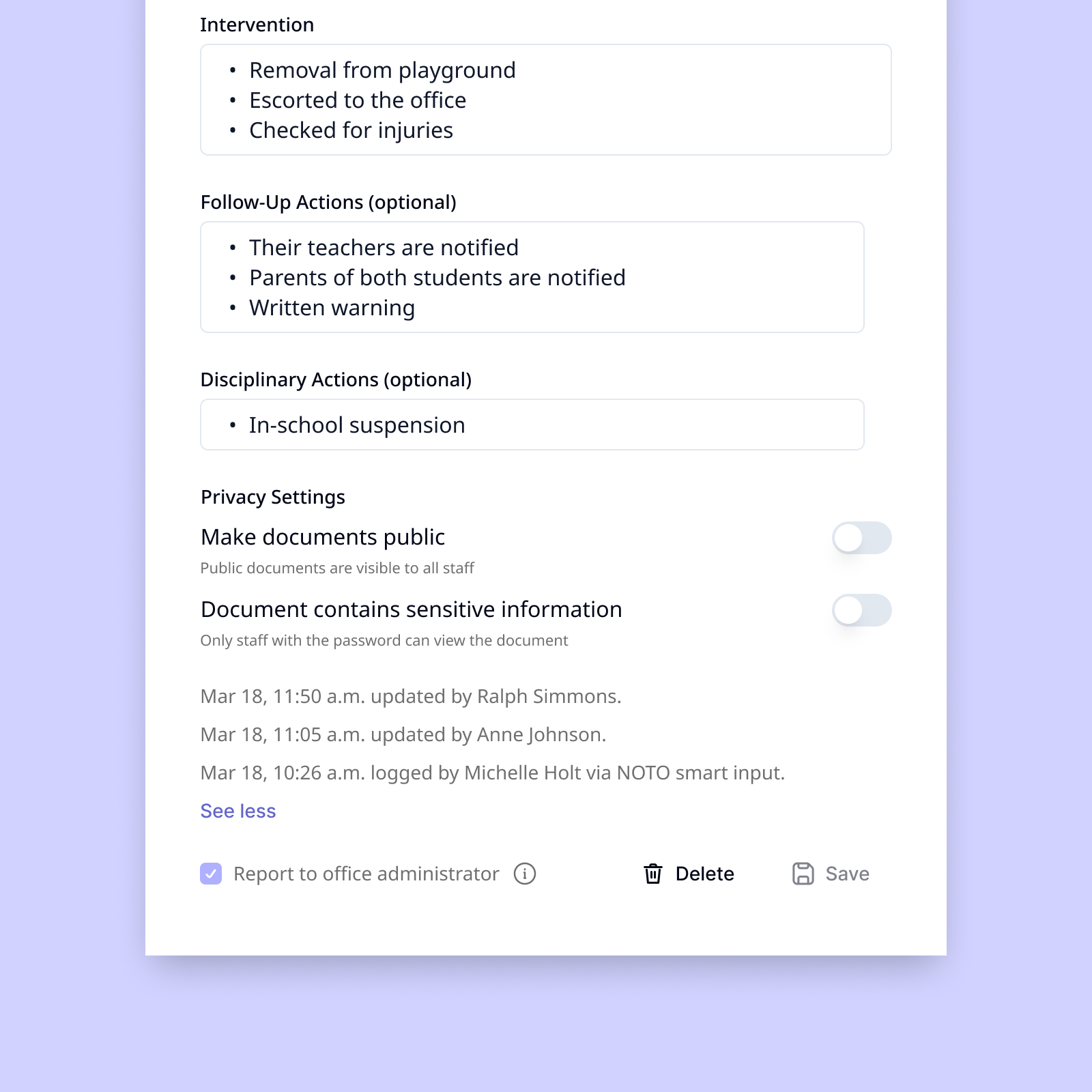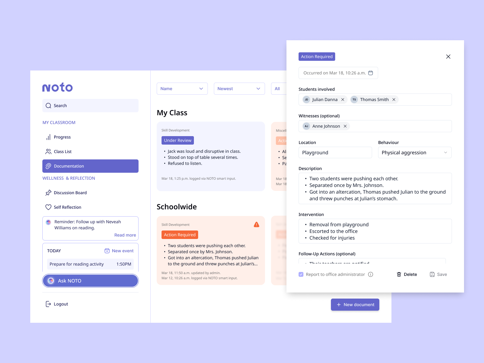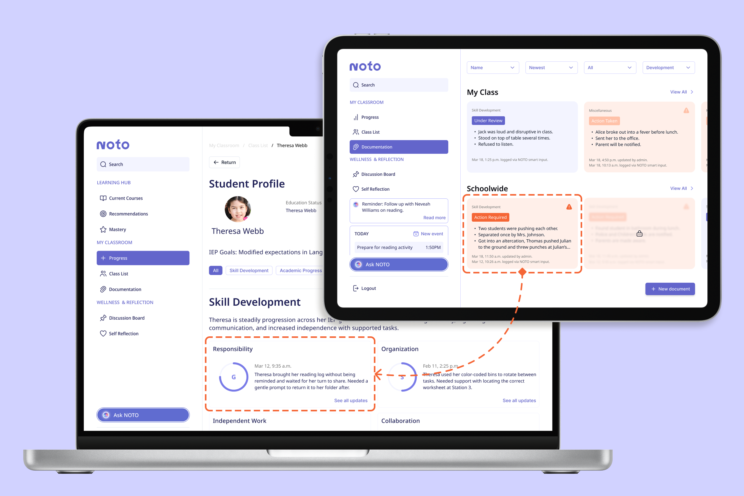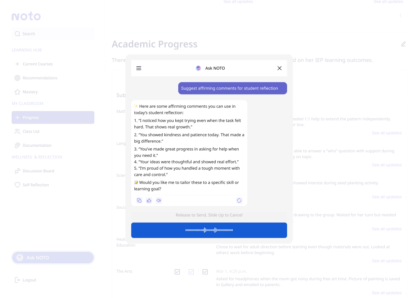 NOTO's smart documentation tool accelerates notetaking and reports, allowing educators to reclaim lost time and reduce redundancy.