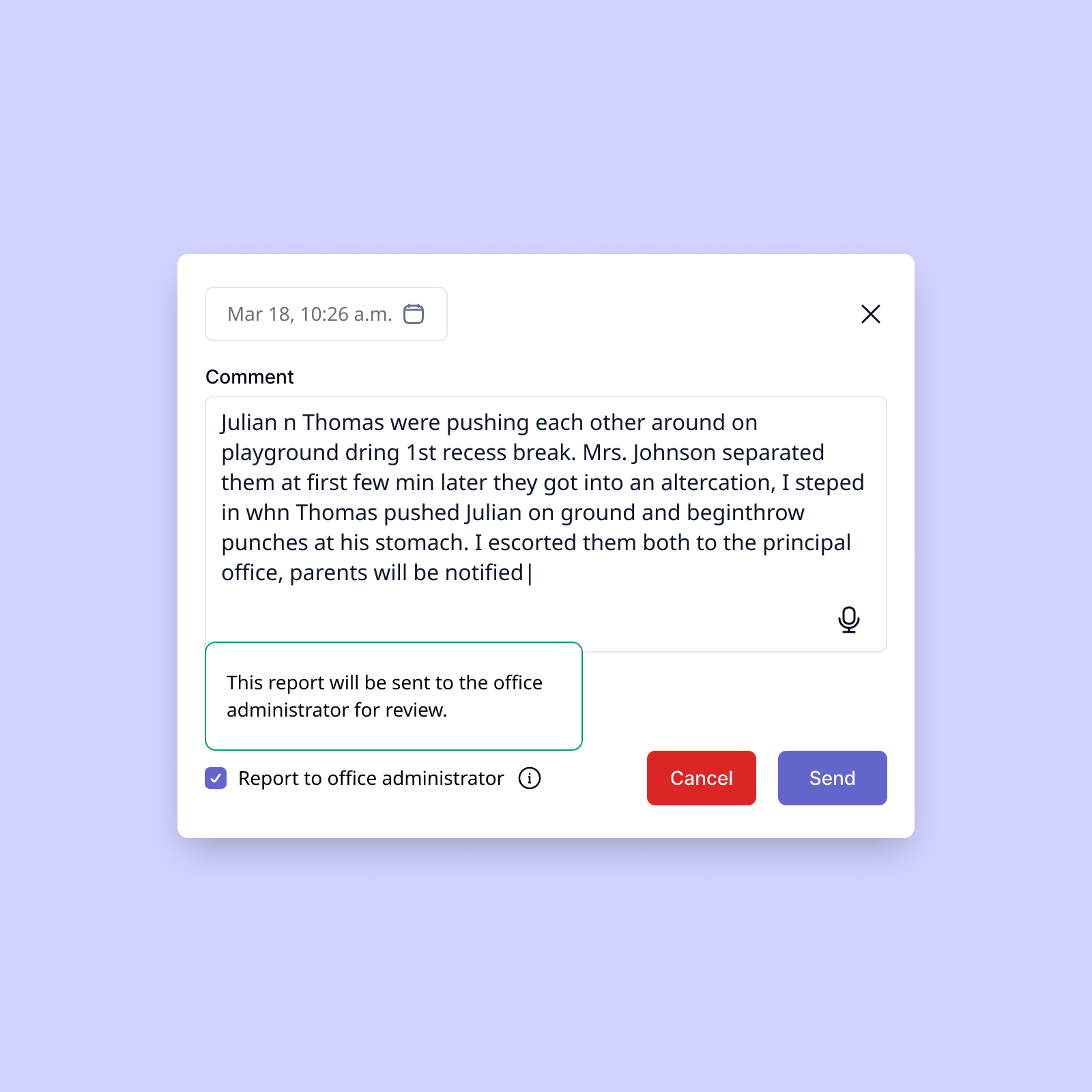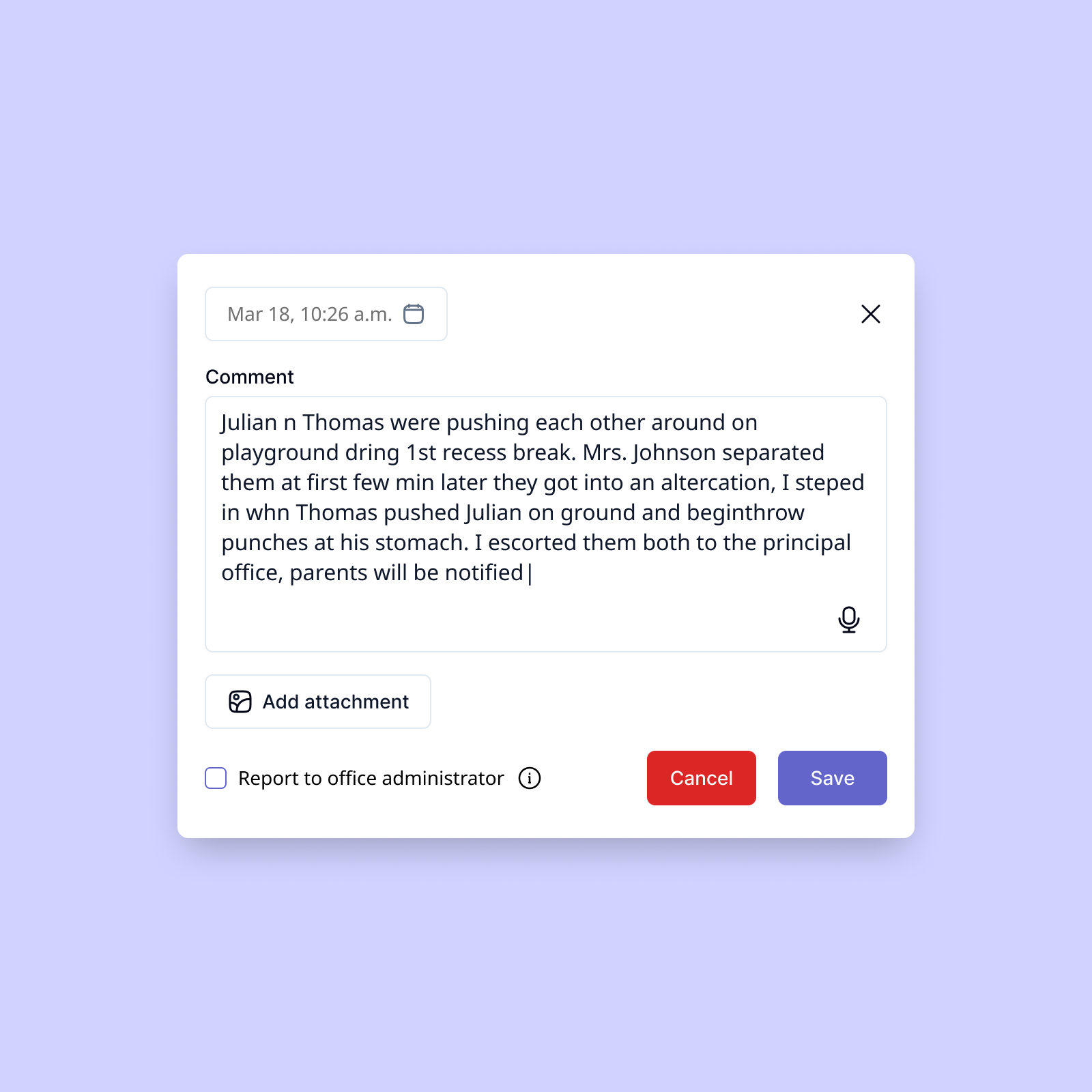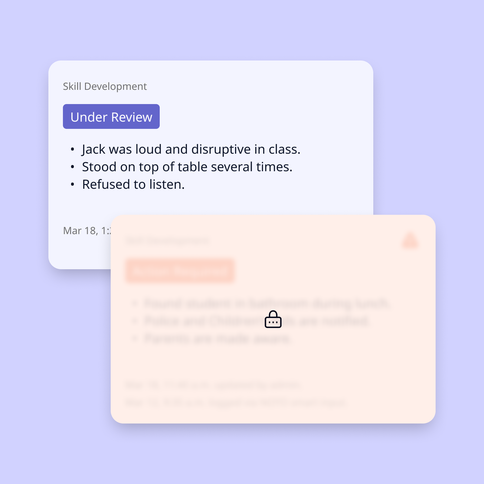 Tablets are more appropriate in a classroom environment, and many teachers already use them in class. We incorporated AI into this feature to distill messy inputs into necessary fields, allowing teachers to forego structure when they need to act fast.