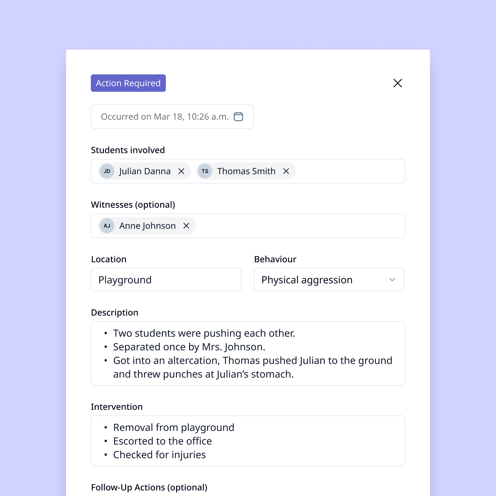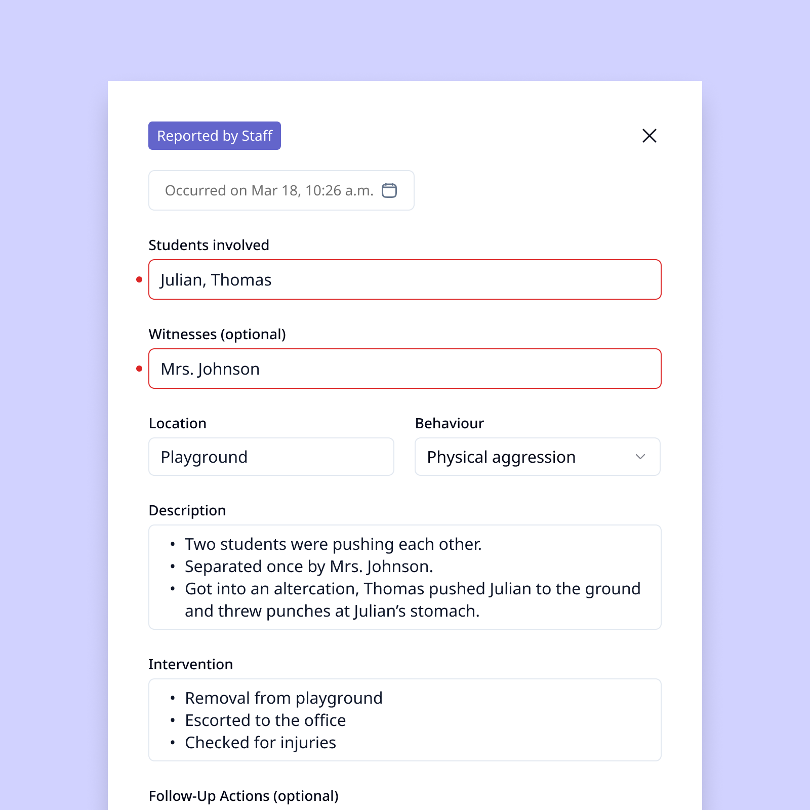 As a teacher, I want to quickly document the student's behaviour as the incident occurs and be able to review it, so I can intervene if needed and handle the paperwork later.
