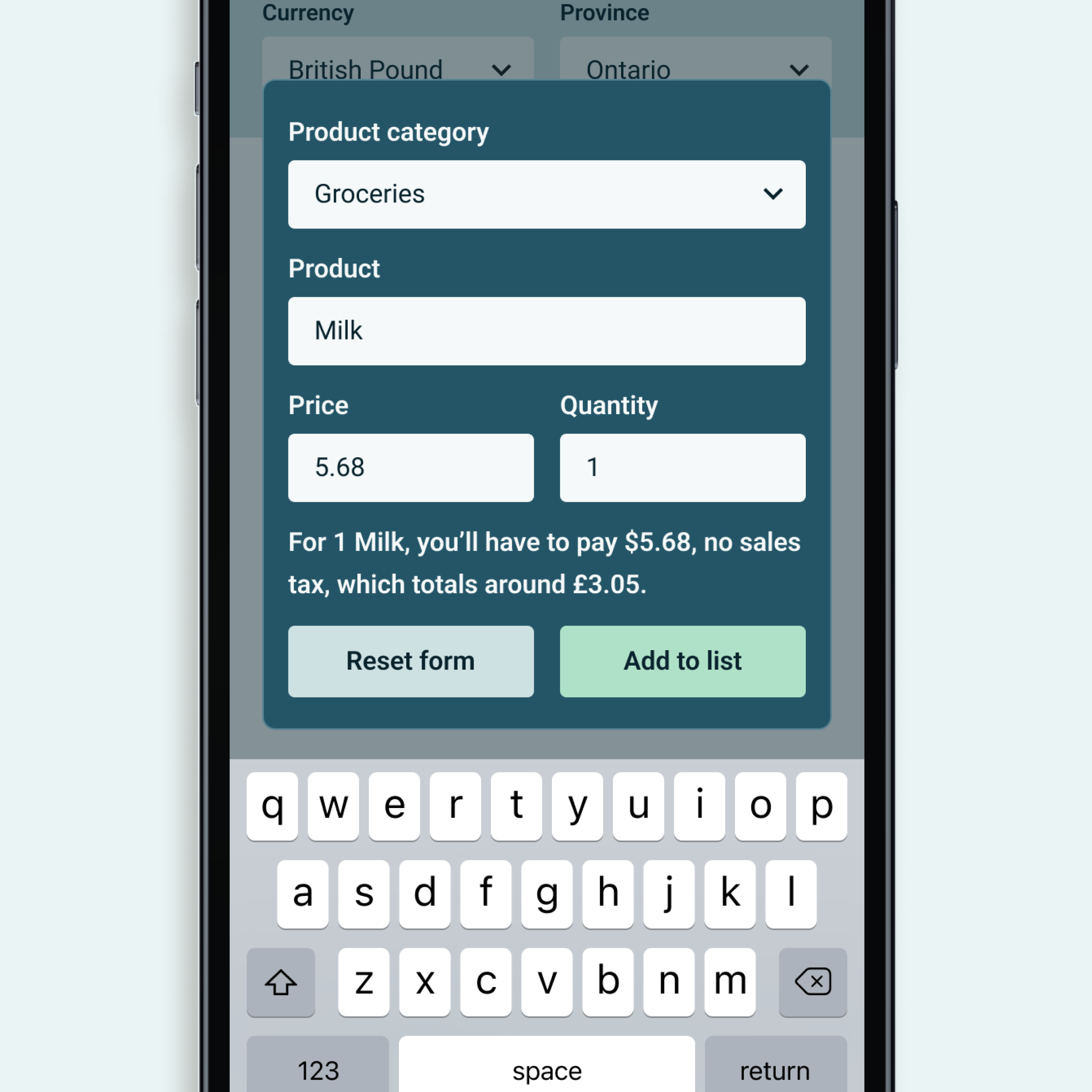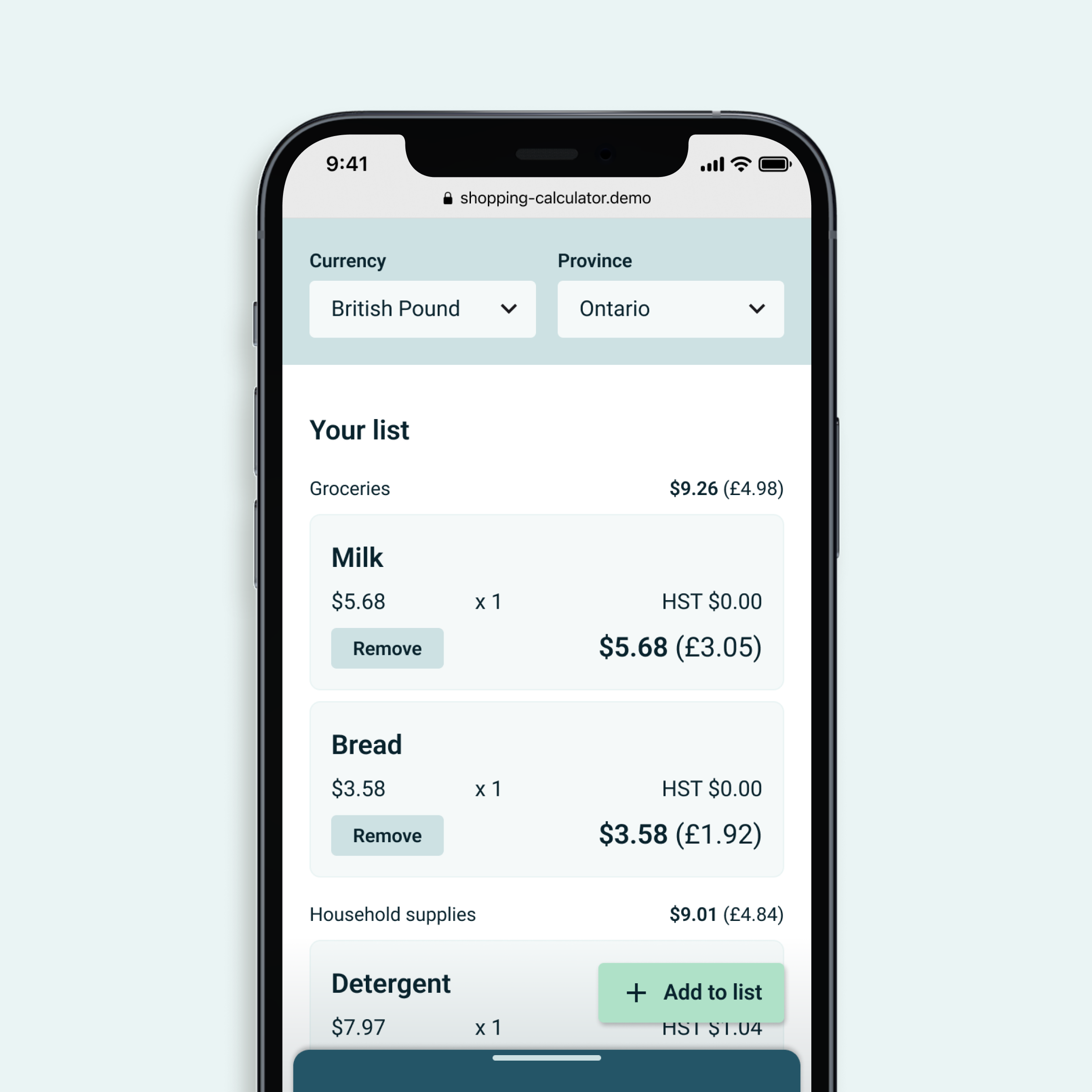 I turned my wireframes into code using HTML, CSS, and JavaScript, and worked out the math for calculations when items are added and removed. I used the Frankfurter API to retrieve conversion rates. The selected currency and province are saved using local storage, allowing the user to skip this selection process when they use the app again.